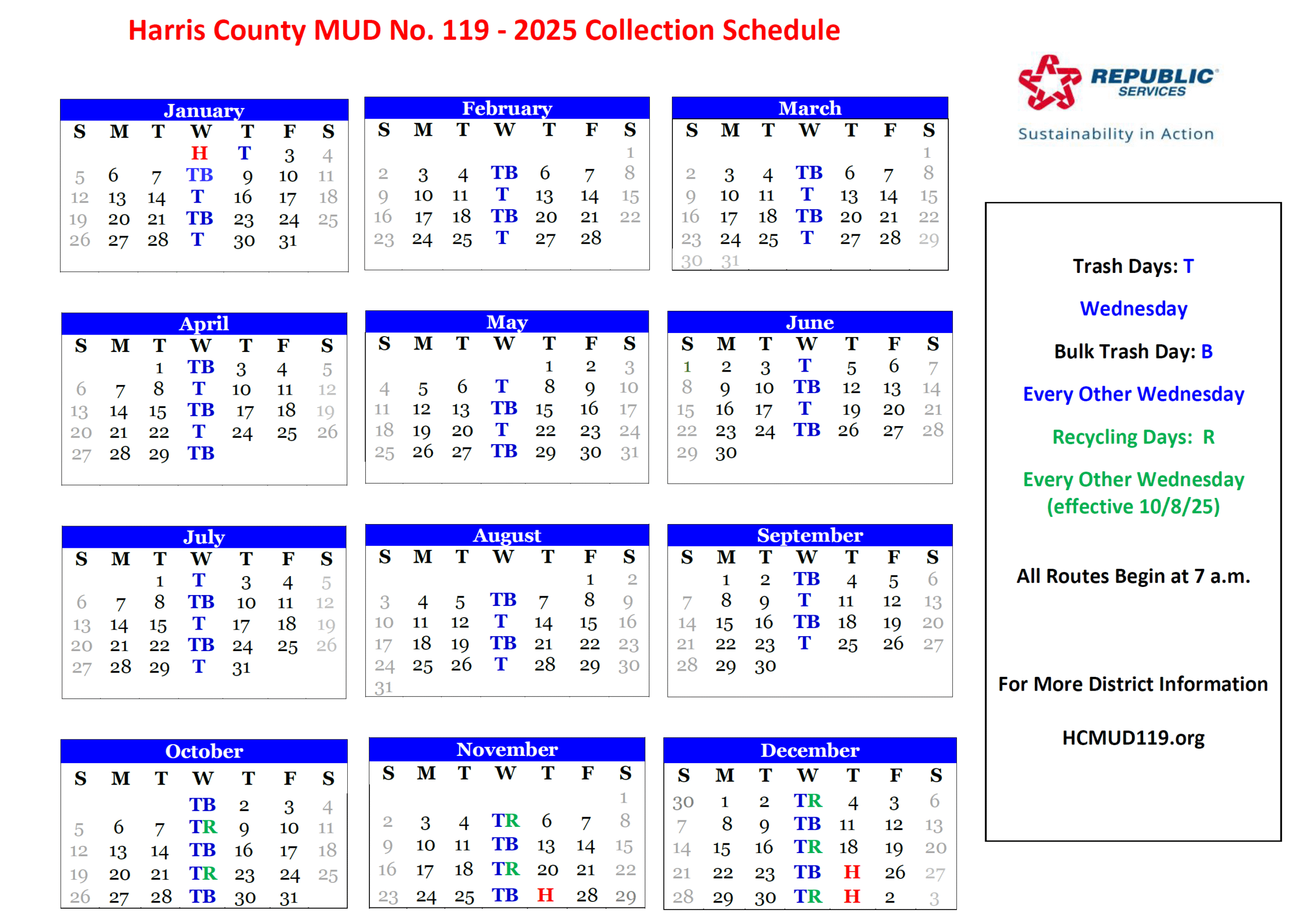 - TRASH COLLECTION – with Republic Services 96 gal trash carts – Every Wednesday.